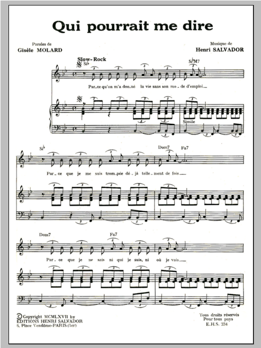 Download or print Henri Salvador Qui Pourrait Me Dire sheet music, chords and digital score arranged for Piano & Vocal. This Pop score includes 2 page(s).