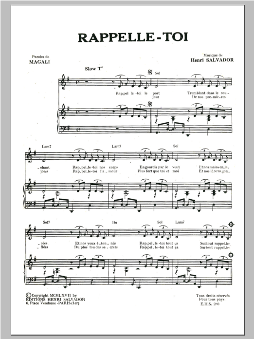 Download or print Henri Salvador Rappelle-Toi sheet music, chords and digital score arranged for Piano & Vocal. This Pop score includes 3 page(s).