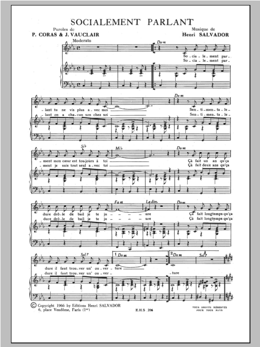 Download or print Henri Salvador Socialement Parlant sheet music, chords and digital score arranged for Piano & Vocal. This Pop score includes 3 page(s).