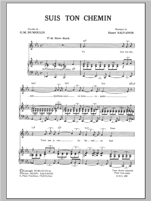Download or print Henri Salvador Suis Ton Chemin sheet music, chords and digital score arranged for Piano & Vocal. This Pop score includes 3 page(s).
