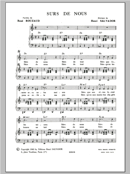 Download or print Henri Salvador Surs De Nous sheet music, chords and digital score arranged for Piano & Vocal. This Pop score includes 2 page(s).