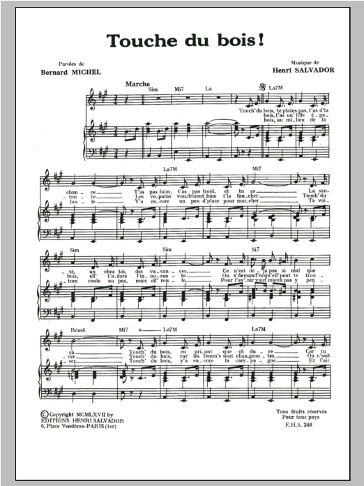 Download or print Henri Salvador Touche Du Bois sheet music, chords and digital score arranged for Piano & Vocal. This Pop score includes 3 page(s).