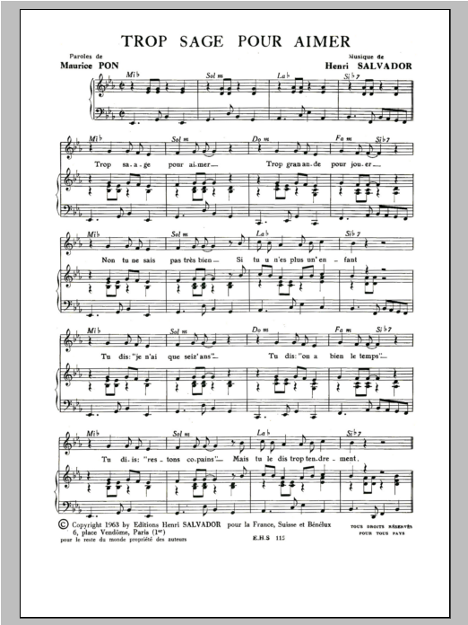 Download or print Henri Salvador Trop Sage Pour Aimer sheet music, chords and digital score arranged for Piano & Vocal. This Pop score includes 2 page(s).