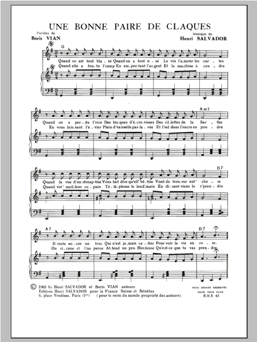Download or print Henri Salvador Une Bonne Paire De Claques sheet music, chords and digital score arranged for Piano & Vocal. This Pop score includes 3 page(s).