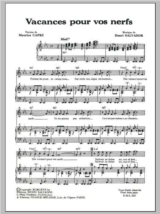 Download or print Henri Salvador Vacances Pour Vos Nerfs sheet music, chords and digital score arranged for Piano & Vocal. This Pop score includes 2 page(s).