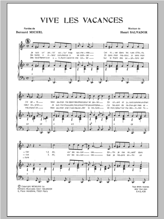 Download or print Henri Salvador Vive Les Vacances sheet music, chords and digital score arranged for Piano & Vocal. This Pop score includes 2 page(s).