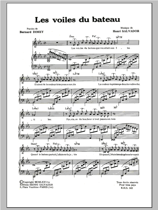 Download or print Henri Salvador Voiles Du Bateau sheet music, chords and digital score arranged for Piano & Vocal. This Pop score includes 3 page(s).