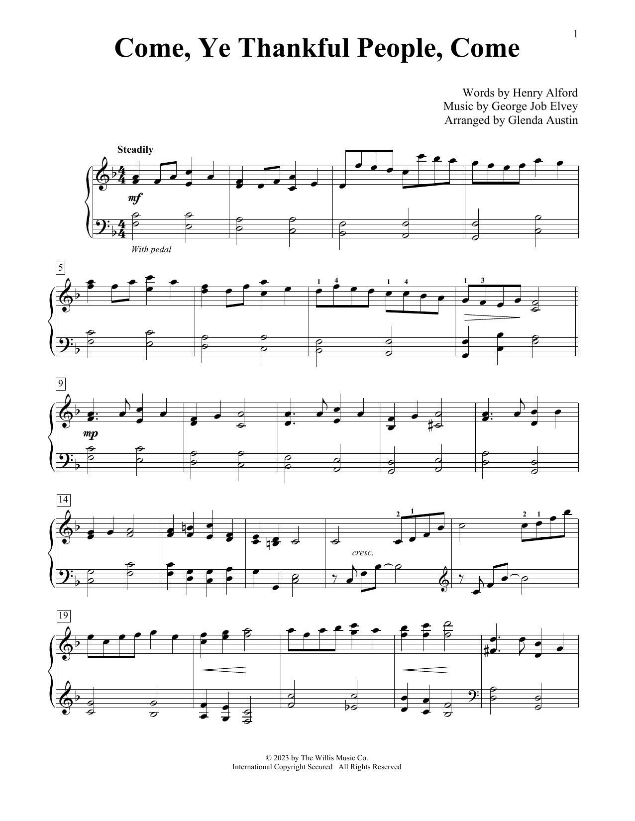 Download or print Henry Alford and George Job Elvey Come, Ye Thankful People, Come (arr. Glenda Austin) sheet music, chords and digital score arranged for Educational Piano. This Sacred score includes 2 page(s).