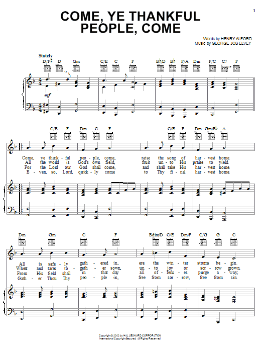 Download or print Henry Alford and George Job Elvey Come, Ye Thankful People, Come sheet music, chords and digital score arranged for Piano, Vocal & Guitar Chords (Right-Hand Melody). This Christian score includes 2 page(s).