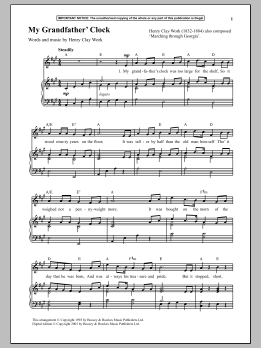 Download or print Henry Clay Work My Grandfather's Clock sheet music, chords and digital score arranged for Piano Chords/Lyrics. This Children score includes 2 page(s).