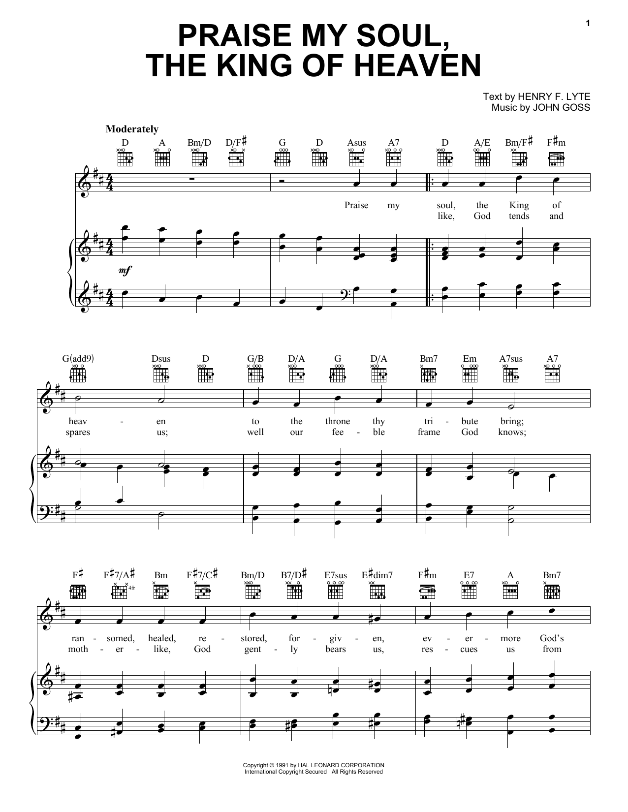 Download or print Henry F. Lyte Praise, My Soul, The King Of Heaven sheet music, chords and digital score arranged for Piano, Vocal & Guitar Chords (Right-Hand Melody). This Sacred score includes 3 page(s).