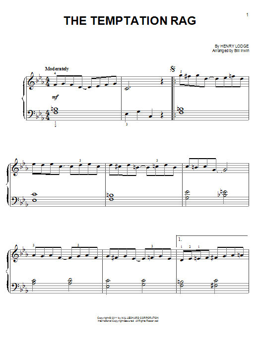 Download or print Henry Lodge The Temptation Rag sheet music, chords and digital score arranged for Easy Piano. This Jazz score includes 3 page(s).