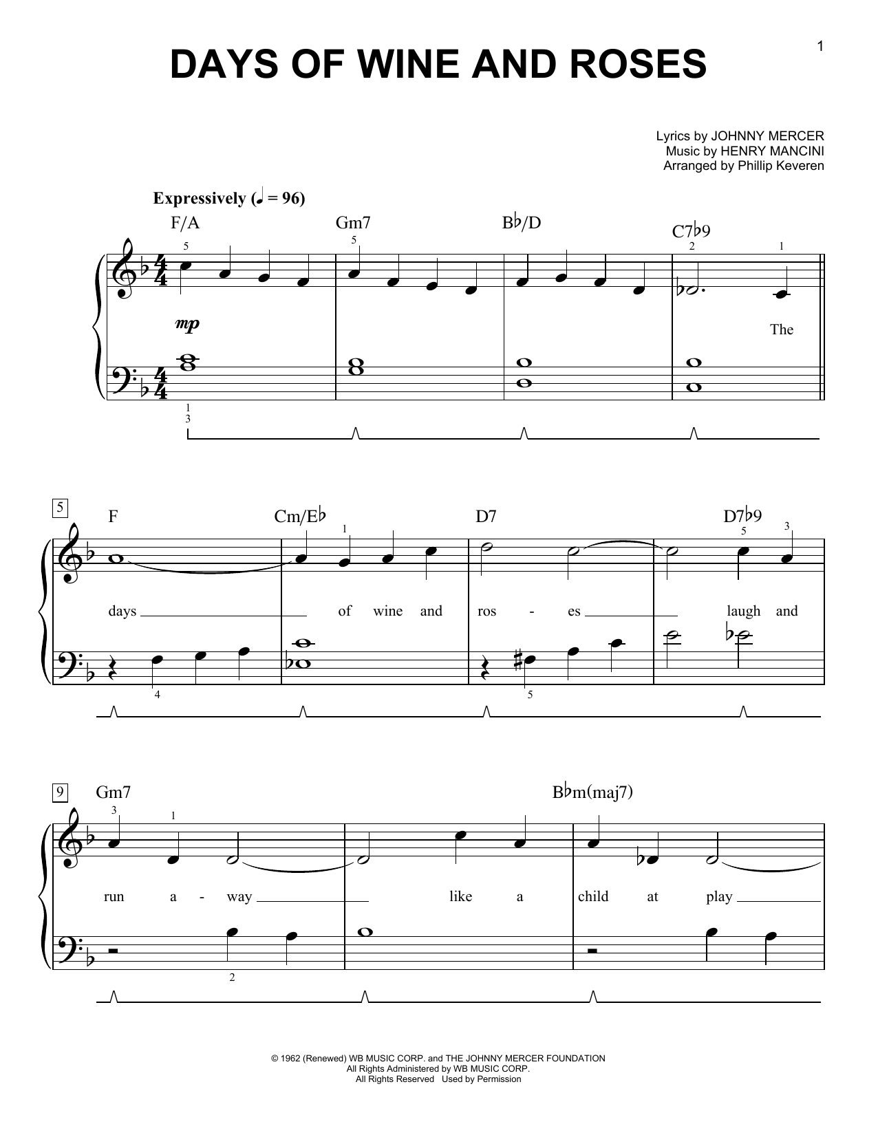 Download or print Henry Mancini Days Of Wine And Roses (arr. Phillip Keveren) sheet music, chords and digital score arranged for Easy Piano. This Jazz score includes 3 page(s).