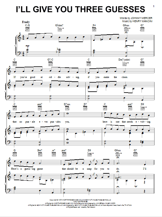 Download or print Henry Mancini I'll Give You Three Guesses sheet music, chords and digital score arranged for Piano, Vocal & Guitar Chords (Right-Hand Melody). This Pop score includes 3 page(s).