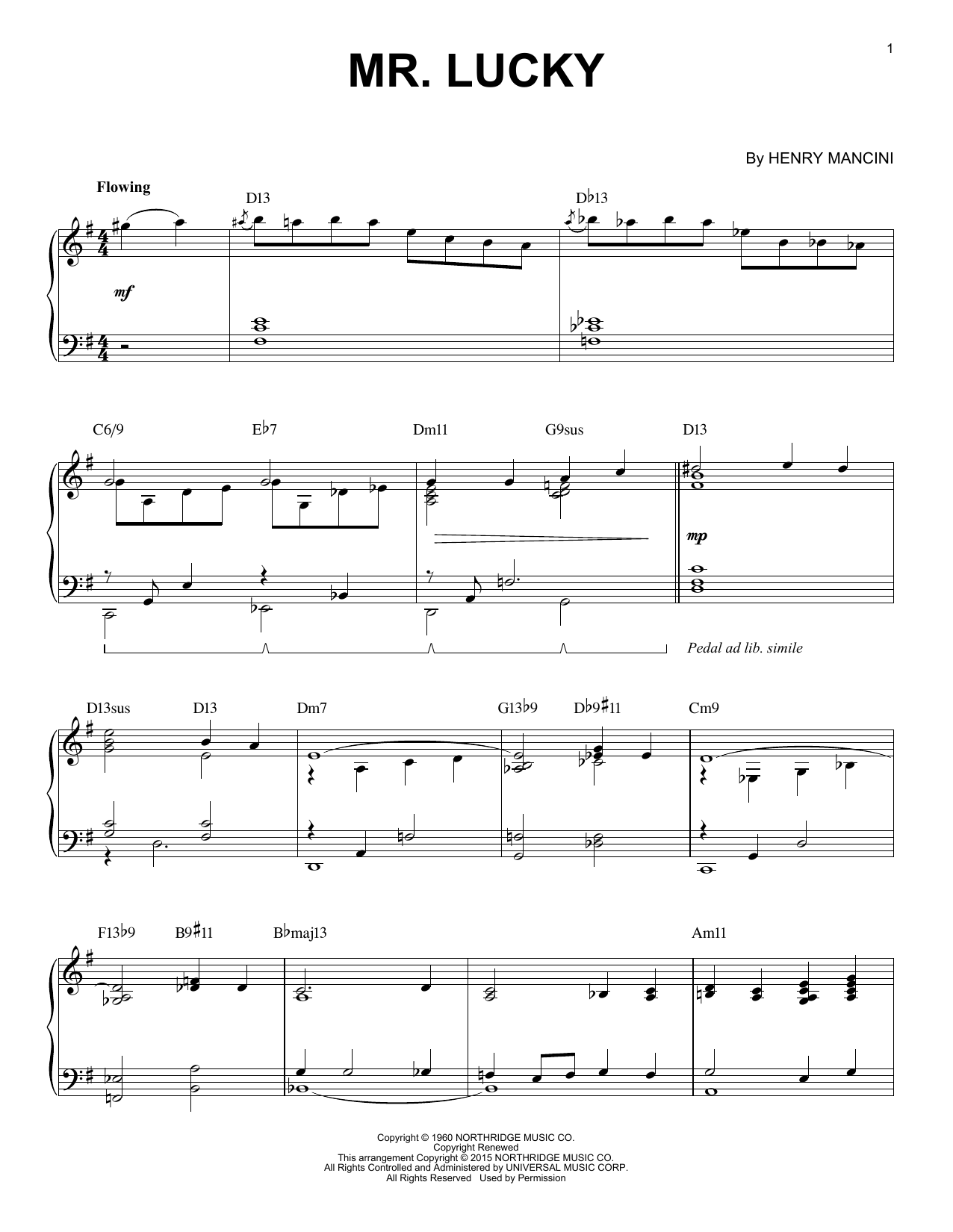 Download or print Henry Mancini Mr. Lucky [Jazz version] (arr. Brent Edstrom) sheet music, chords and digital score arranged for Piano Solo. This Jazz score includes 5 page(s).