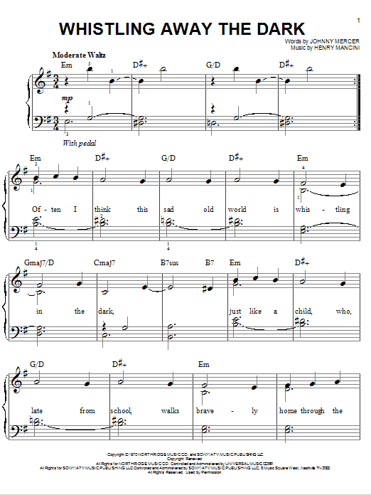 Download or print Henry Mancini Whistling Away The Dark sheet music, chords and digital score arranged for Piano Solo. This Standards score includes 6 page(s).