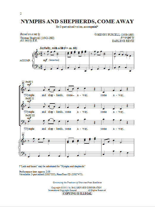 Download or print Earlene Rentz Nymphs And Shepherds, Come Away sheet music, chords and digital score arranged for 3-Part Mixed Choir. This Concert score includes 11 page(s).