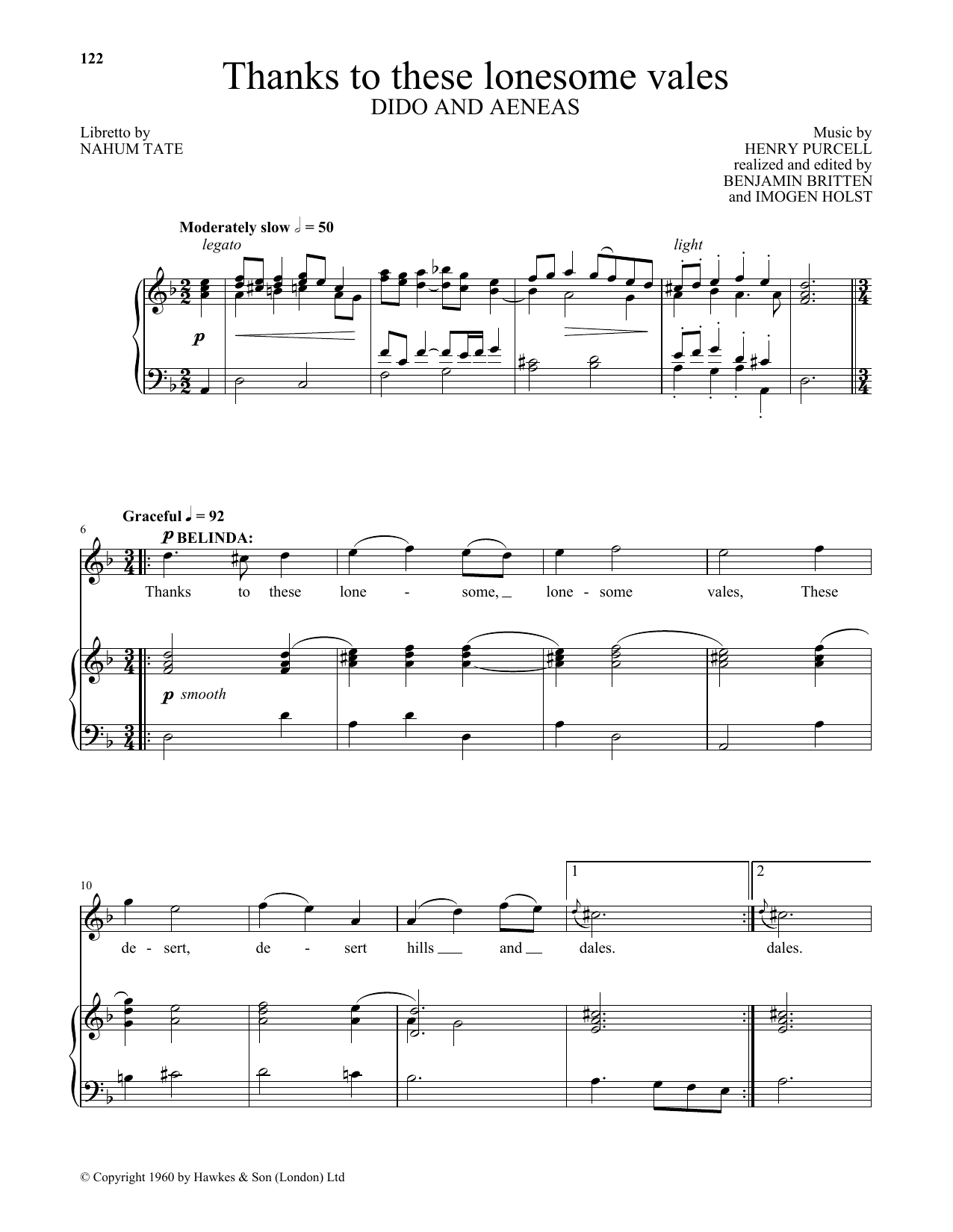 Download or print Henry Purcell Thanks to these lonesome vales (from Dido And Aeneas) sheet music, chords and digital score arranged for Piano & Vocal. This Classical score includes 2 page(s).