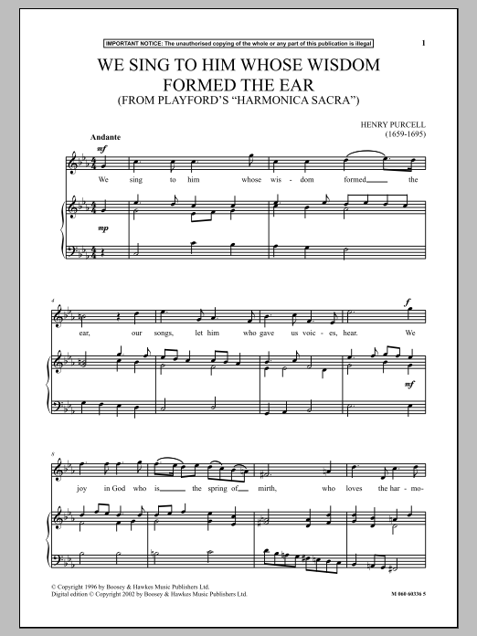 Download or print Henry Purcell We Sing To Him Whose Wisdom Formed The Ear (From Playford's Harmonica Sacra) sheet music, chords and digital score arranged for Piano & Vocal. This Classical score includes 3 page(s).