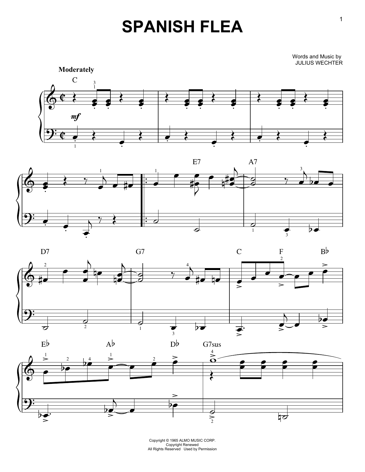 Download or print Herb Alpert & The Tijuana Brass Spanish Flea sheet music, chords and digital score arranged for Piano, Vocal & Guitar Chords (Right-Hand Melody). This Latin score includes 4 page(s).