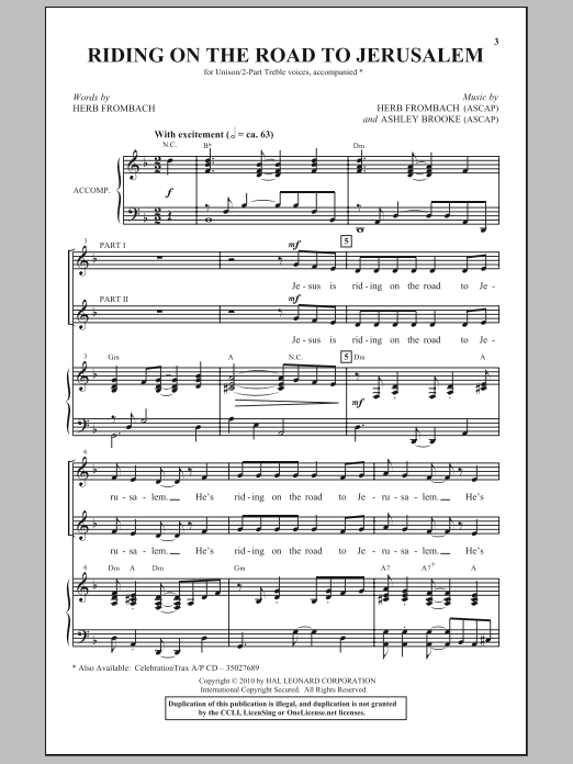 Download or print Herb Frombach Riding On The Road To Jerusalem sheet music, chords and digital score arranged for 2-Part Choir. This Easter score includes 6 page(s).