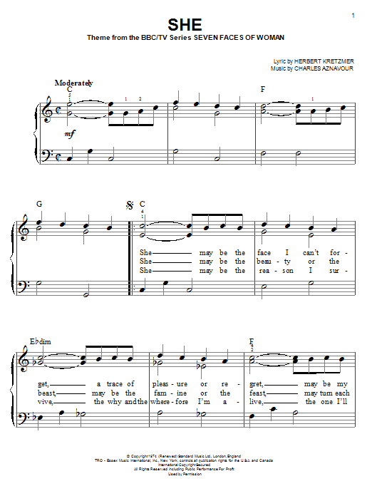 Download or print Herbert Kretzmer She sheet music, chords and digital score arranged for Piano, Vocal & Guitar Chords (Right-Hand Melody). This Film/TV score includes 3 page(s).