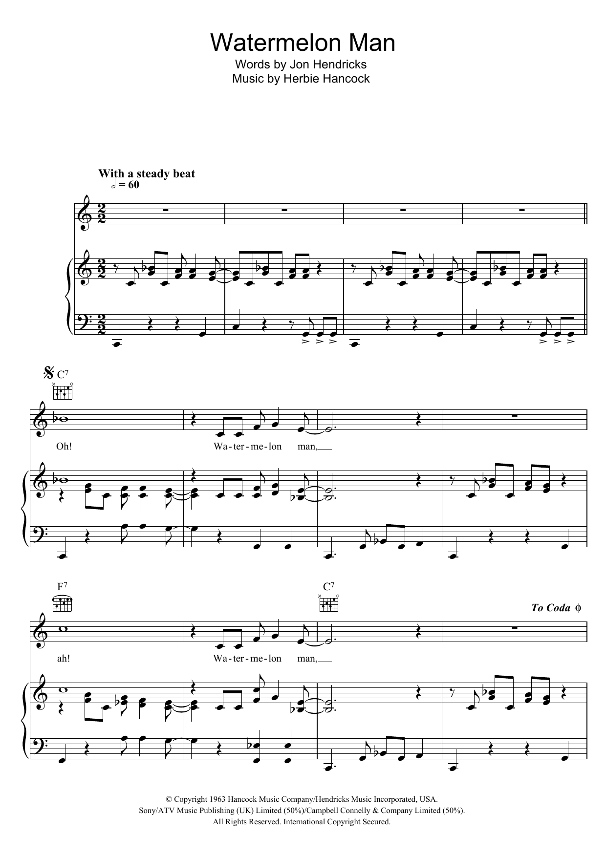 Download or print Herbie Hancock Watermelon Man sheet music, chords and digital score arranged for Piano, Vocal & Guitar Chords. This Blues score includes 4 page(s).