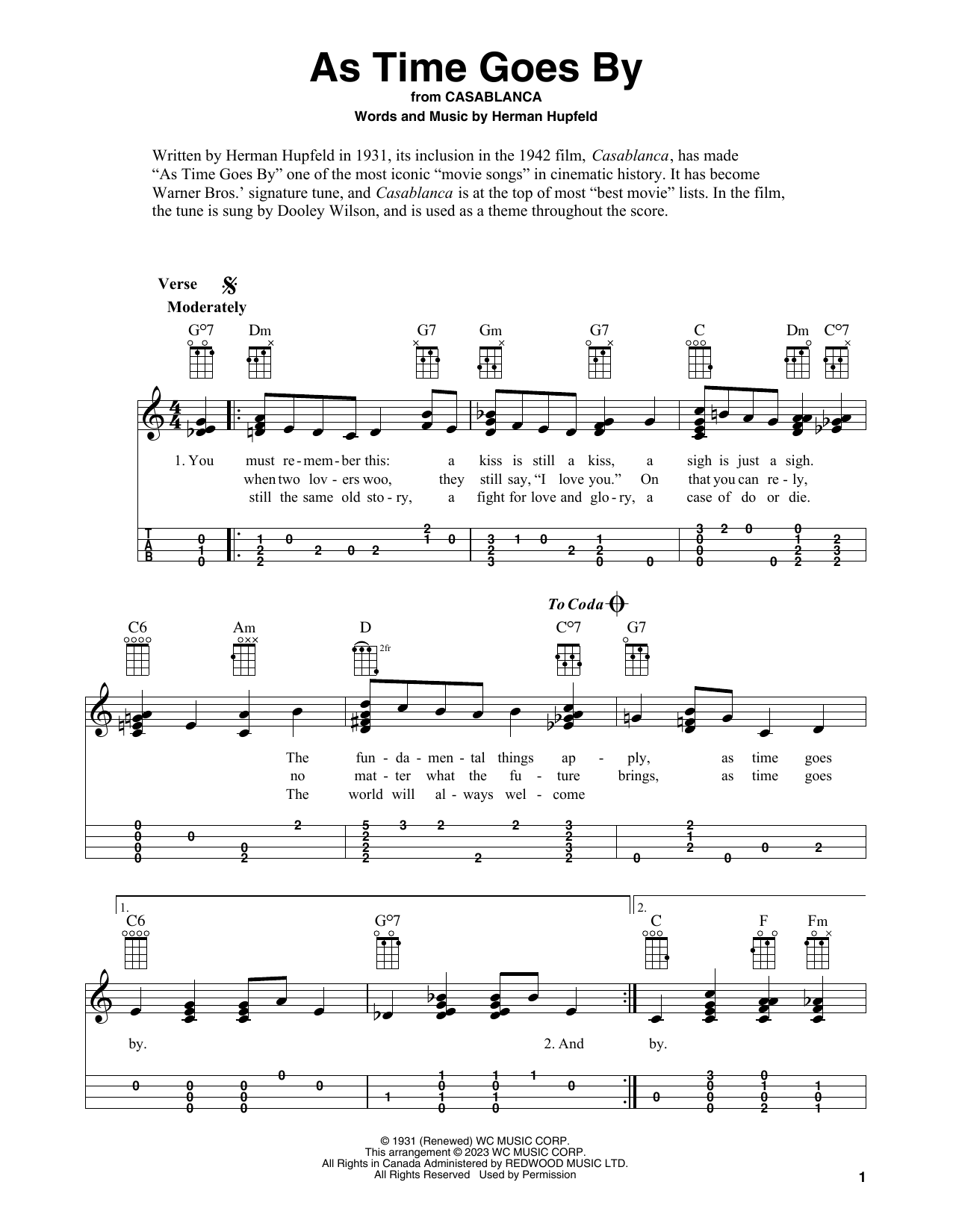 Download or print Herman Hupfeld As Time Goes By (from Casablanca) sheet music, chords and digital score arranged for Easy Ukulele Tab. This Jazz score includes 3 page(s).