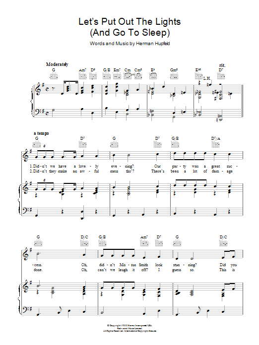 Download or print Herman Hupfeld Let's Put Out The Lights (And Go To Sleep) sheet music, chords and digital score arranged for Piano, Vocal & Guitar Chords. This Standards score includes 6 page(s).