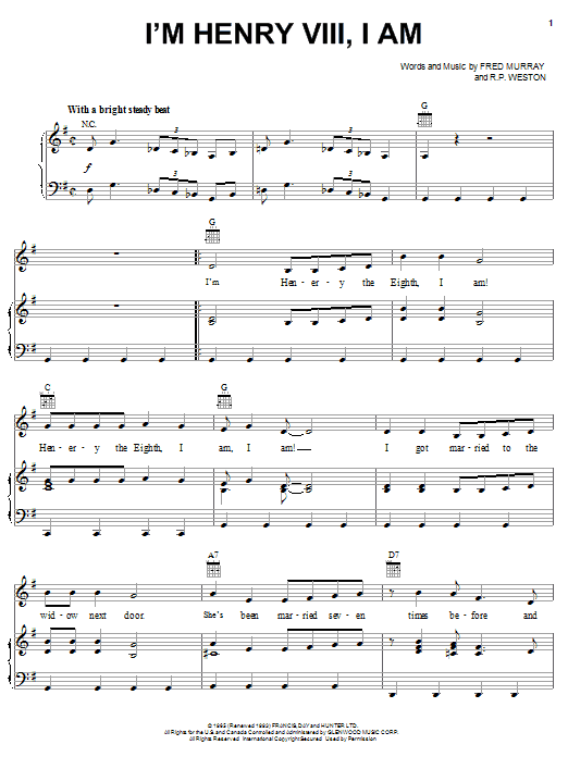 Download or print Herman's Hermits I'm Henry VIII, I Am sheet music, chords and digital score arranged for Piano & Vocal. This Pop score includes 2 page(s).
