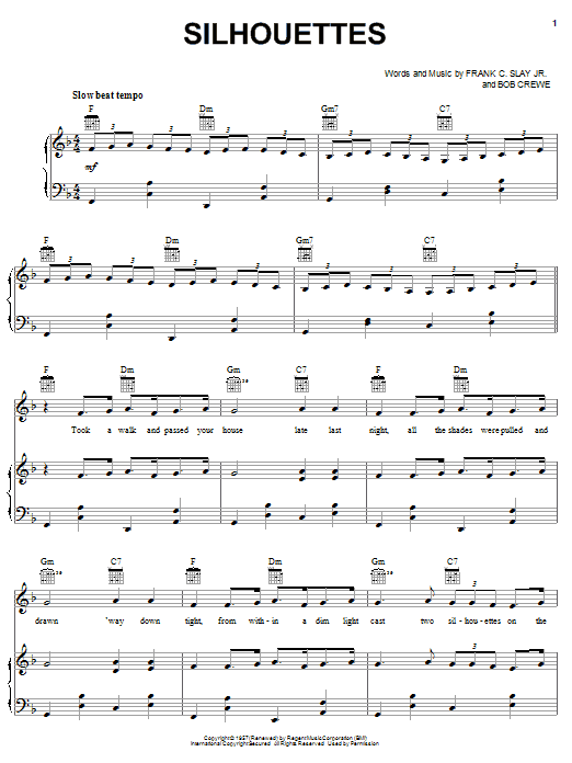 Download or print Herman's Hermits Silhouettes sheet music, chords and digital score arranged for Piano, Vocal & Guitar Chords (Right-Hand Melody). This Oldies score includes 4 page(s).