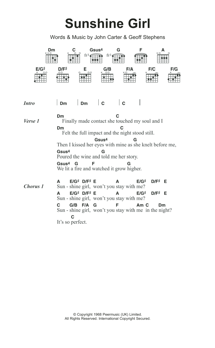 Download or print Herman's Hermits Sunshine Girl sheet music, chords and digital score arranged for Guitar Chords/Lyrics. This Pop score includes 2 page(s).