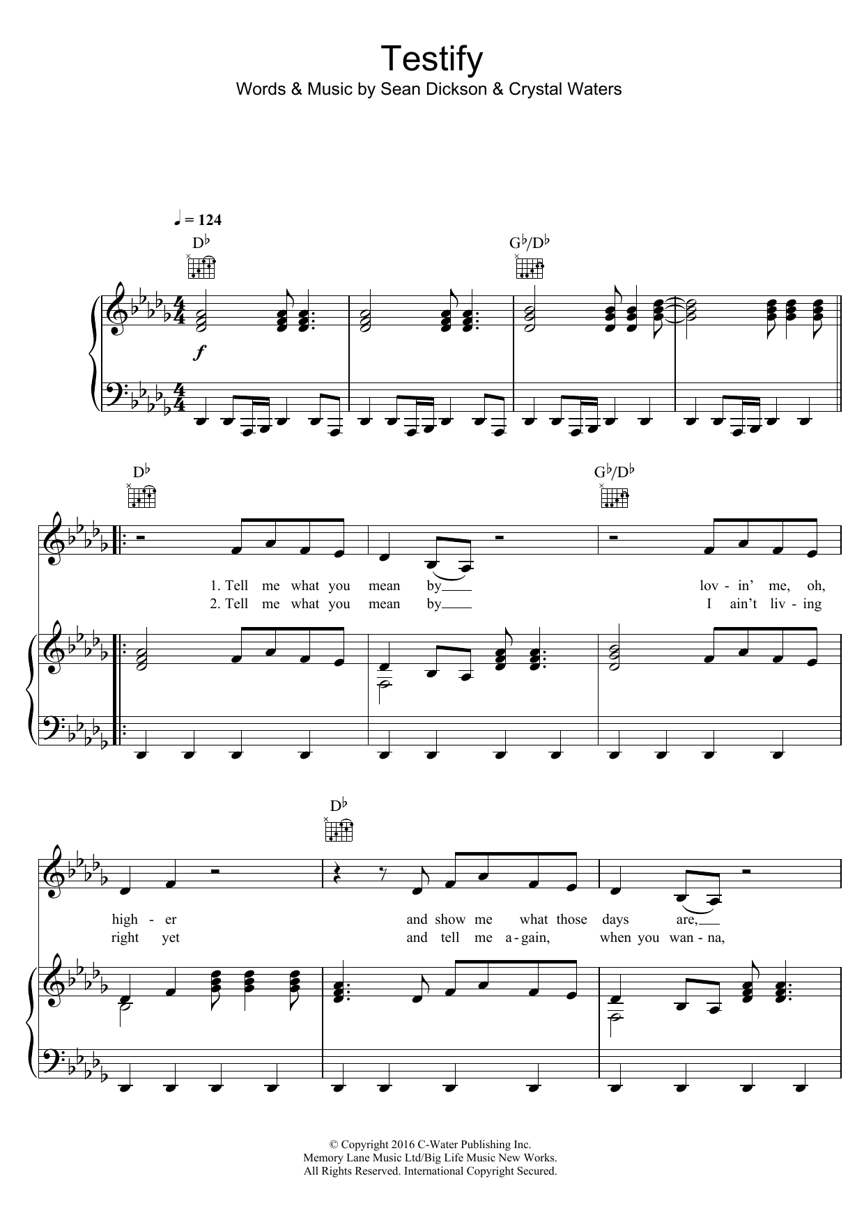 Download or print Hifi Sean Testify (featuring Crystal Waters) sheet music, chords and digital score arranged for Piano, Vocal & Guitar Chords. This Pop score includes 6 page(s).