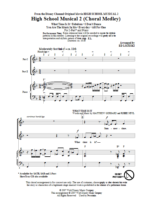 Download or print Ed Lojeski High School Musical 2 (Choral Medley) sheet music, chords and digital score arranged for SATB Choir. This Disney score includes 38 page(s).