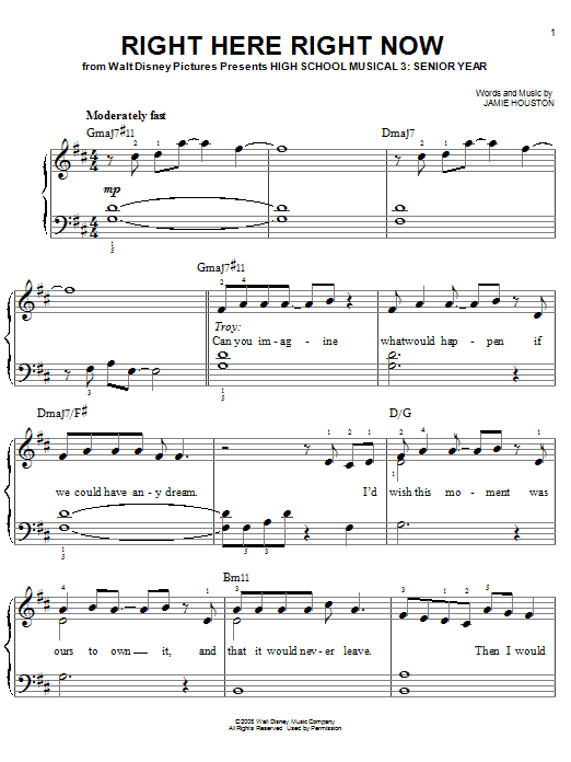 Download or print High School Musical 3 Right Here Right Now sheet music, chords and digital score arranged for Piano Solo. This Disney score includes 7 page(s).