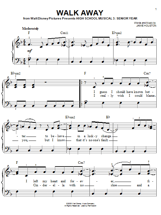 Download or print High School Musical 3 Walk Away sheet music, chords and digital score arranged for Big Note Piano. This Disney score includes 6 page(s).