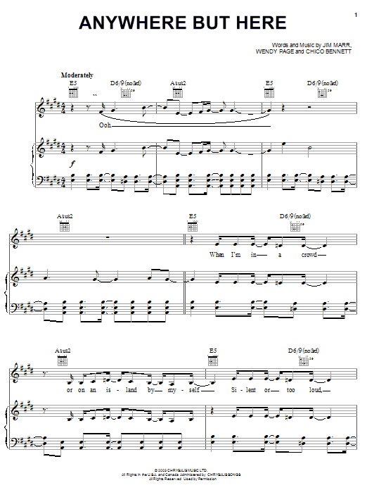 Download or print Hilary Duff Anywhere But Here sheet music, chords and digital score arranged for Piano, Vocal & Guitar Chords (Right-Hand Melody). This Pop score includes 10 page(s).