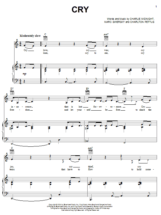 Download or print Hilary Duff Cry sheet music, chords and digital score arranged for Piano, Vocal & Guitar Chords (Right-Hand Melody). This Pop score includes 6 page(s).