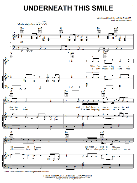 Download or print Hilary Duff Underneath This Smile sheet music, chords and digital score arranged for Piano, Vocal & Guitar Chords (Right-Hand Melody). This Pop score includes 6 page(s).
