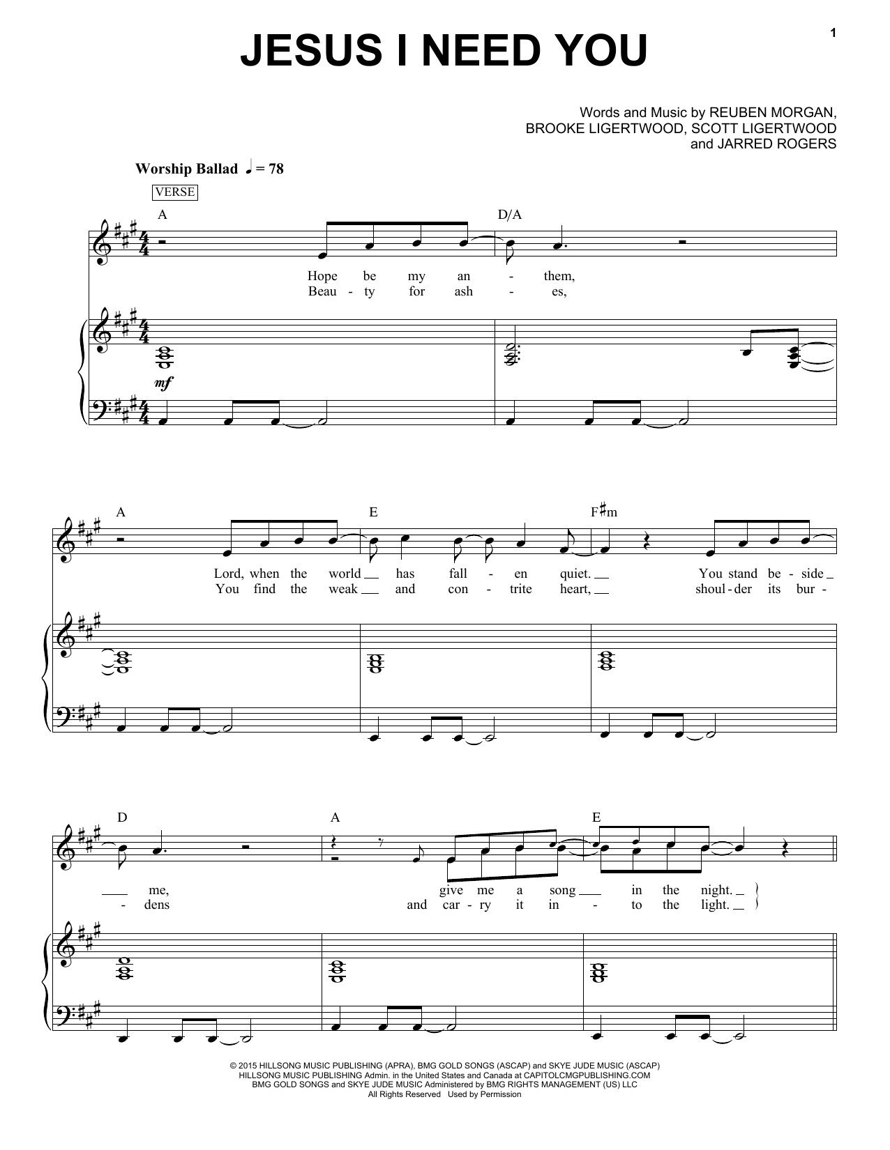 Download or print Hillsong Worship Jesus I Need You sheet music, chords and digital score arranged for Piano & Vocal. This Christian score includes 6 page(s).