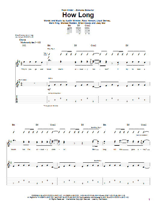 Download or print Hinder How Long sheet music, chords and digital score arranged for Guitar Tab. This Pop score includes 7 page(s).