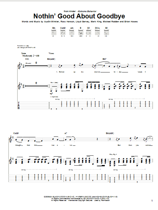 Download or print Hinder Nothin' Good About Goodbye sheet music, chords and digital score arranged for Guitar Tab. This Pop score includes 8 page(s).