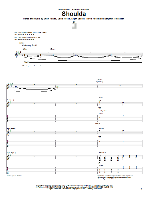 Download or print Hinder Shoulda sheet music, chords and digital score arranged for Guitar Tab. This Pop score includes 9 page(s).