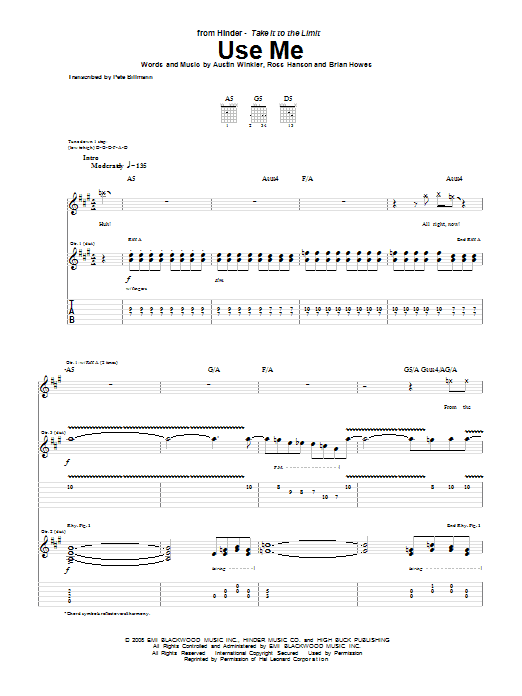 Download or print Hinder Use Me sheet music, chords and digital score arranged for Guitar Tab. This Pop score includes 11 page(s).