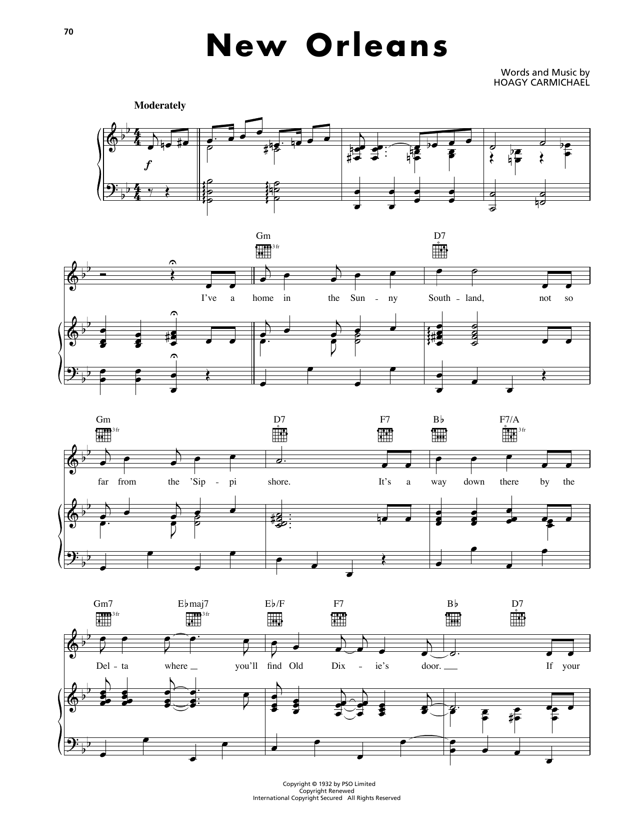 Download or print Hoagy Carmichael New Orleans sheet music, chords and digital score arranged for Piano, Vocal & Guitar Chords (Right-Hand Melody). This Jazz score includes 3 page(s).