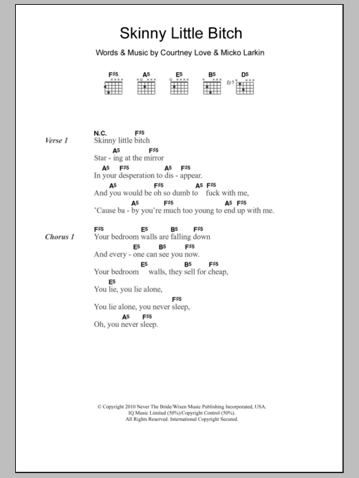 Download or print Hole Skinny Little Bitch sheet music, chords and digital score arranged for Guitar Chords/Lyrics. This Rock score includes 3 page(s).