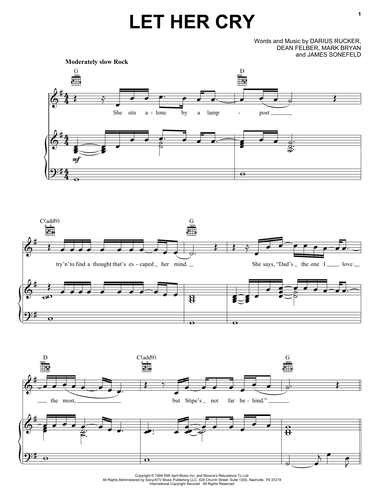 Download or print Hootie & The Blowfish Let Her Cry sheet music, chords and digital score arranged for Piano, Vocal & Guitar Chords (Right-Hand Melody). This Pop score includes 4 page(s).