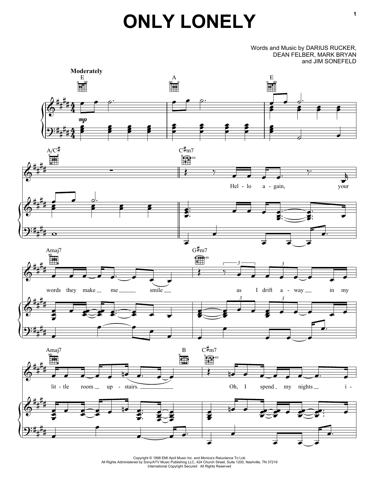 Download or print Hootie & The Blowfish Only Lonely sheet music, chords and digital score arranged for Piano, Vocal & Guitar Chords (Right-Hand Melody). This Pop score includes 8 page(s).