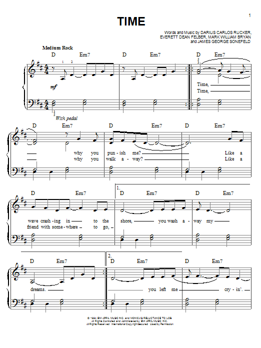 Download or print Hootie & The Blowfish Time sheet music, chords and digital score arranged for Piano, Vocal & Guitar Chords (Right-Hand Melody). This Pop score includes 8 page(s).