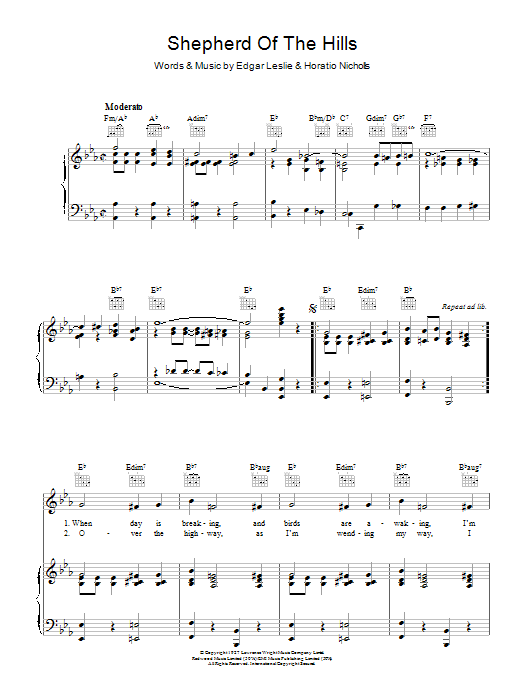 Download or print Horatio Nicholls Shepherd Of The Hills sheet music, chords and digital score arranged for Piano, Vocal & Guitar Chords. This Standards score includes 5 page(s).